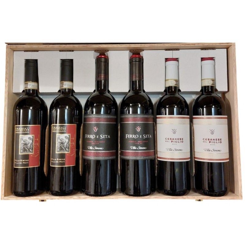 Cassetta contenente n°2 Ferro e Seta Villa Simone, n°2 Frascati superiore Villa dei Preti e n°2 Cesanese del Piglio Villa Simone DOCG.
