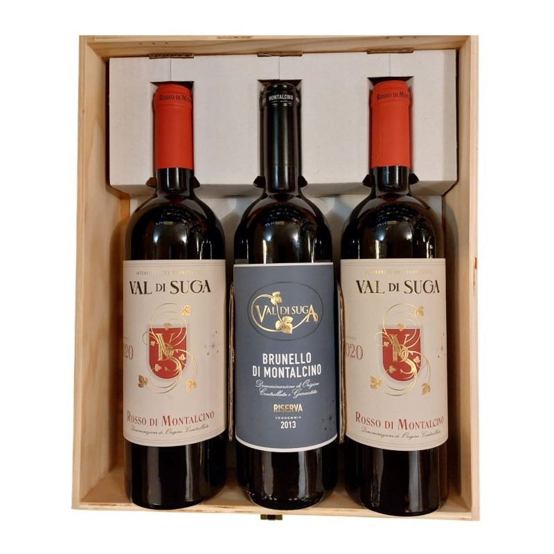 Cassetta contenente n°2 Rosso di Montalcino Val di Suga e n°1 Brunello di Montalcino Val di Suga Riserva.