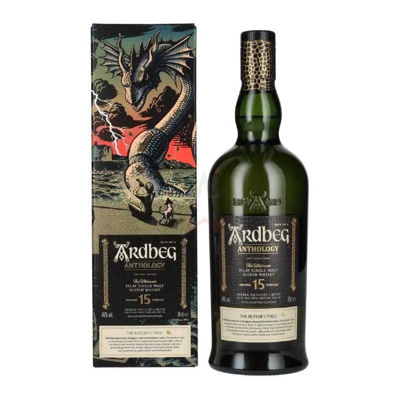 L’Ardbeg 15 Years Old The Beithir's Tale è un Single Malt di Islay che unisce intensità aromatica e suggestione mitologica. Invecchiato in quercia bianca americana e in particolari botti selezionate, si presenta con una struttura complessa e avvolgente. Al naso emergono sfumature di spezie pungenti, dolcezza di malto caramellato, cenni di erbe affumicate e frutta matura, arricchite da tocchi balsamici che ricordano eucalipto e mentolo. Il palato rivela un equilibrio tra torba fumosa, toni di caffè tostato e accenti fruttati che richiamano agrumi canditi e ribes. La persistenza è profonda e stratificata, con ritorni di vaniglia cremosa e delicate note di burro affumicato, segno distintivo dello stile Ardbeg.